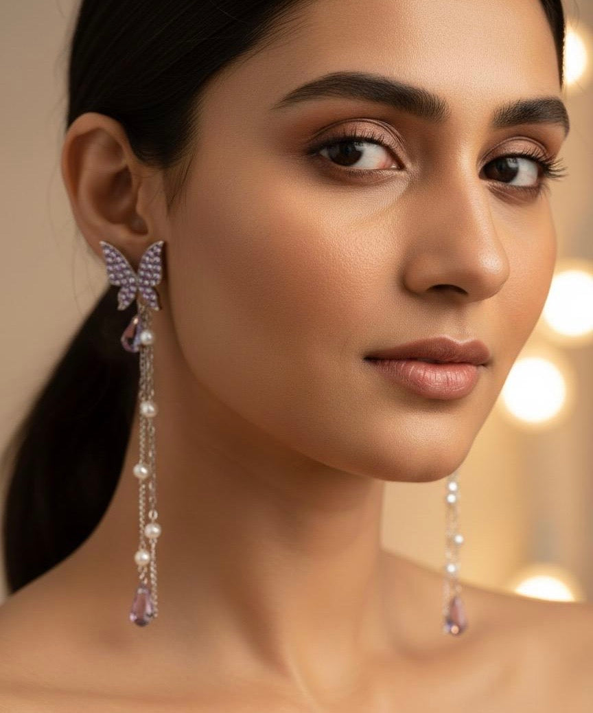 Add a touch of elegance to your look with these Lavender Butterfly Pearl Drop Earrings. Designed with sparkling butterfly crystals and delicate pearl danglers, these earrings bring a soft, graceful charm perfect for both everyday wear and special occasions.